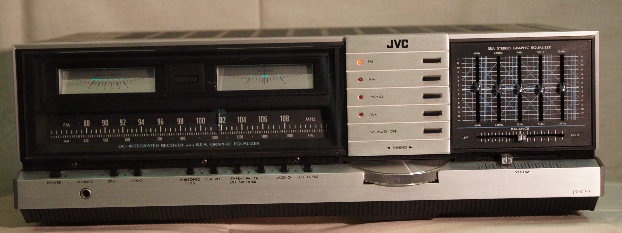 JVC – receiver JR-S201 lämnar 2 x 35 W vid 8 ohm. SEA tonkontroll för ljudinställning. Phonoingång för MM.pick-up. DC-kopplat effektsteg med elektroniska skyddskretsar. Vikt 10,6 kg. Tillverkningsår 1978