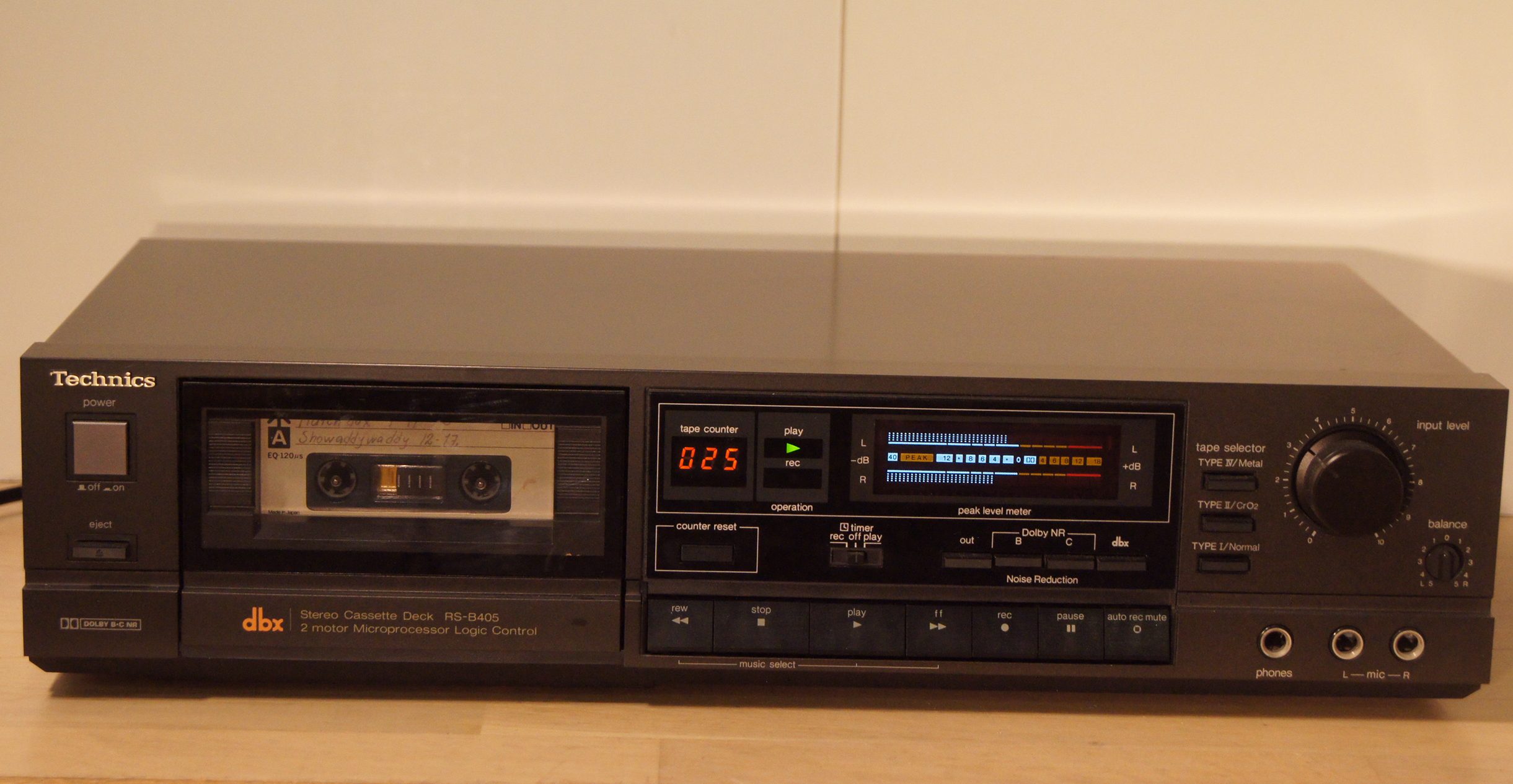 Technics – kassettdäck RS-B405. 2 motors relästyrt däck med Dolby B, C och dbx brusreducering. Auto melodisökning. Tillverkningsår 1986 – 1988.