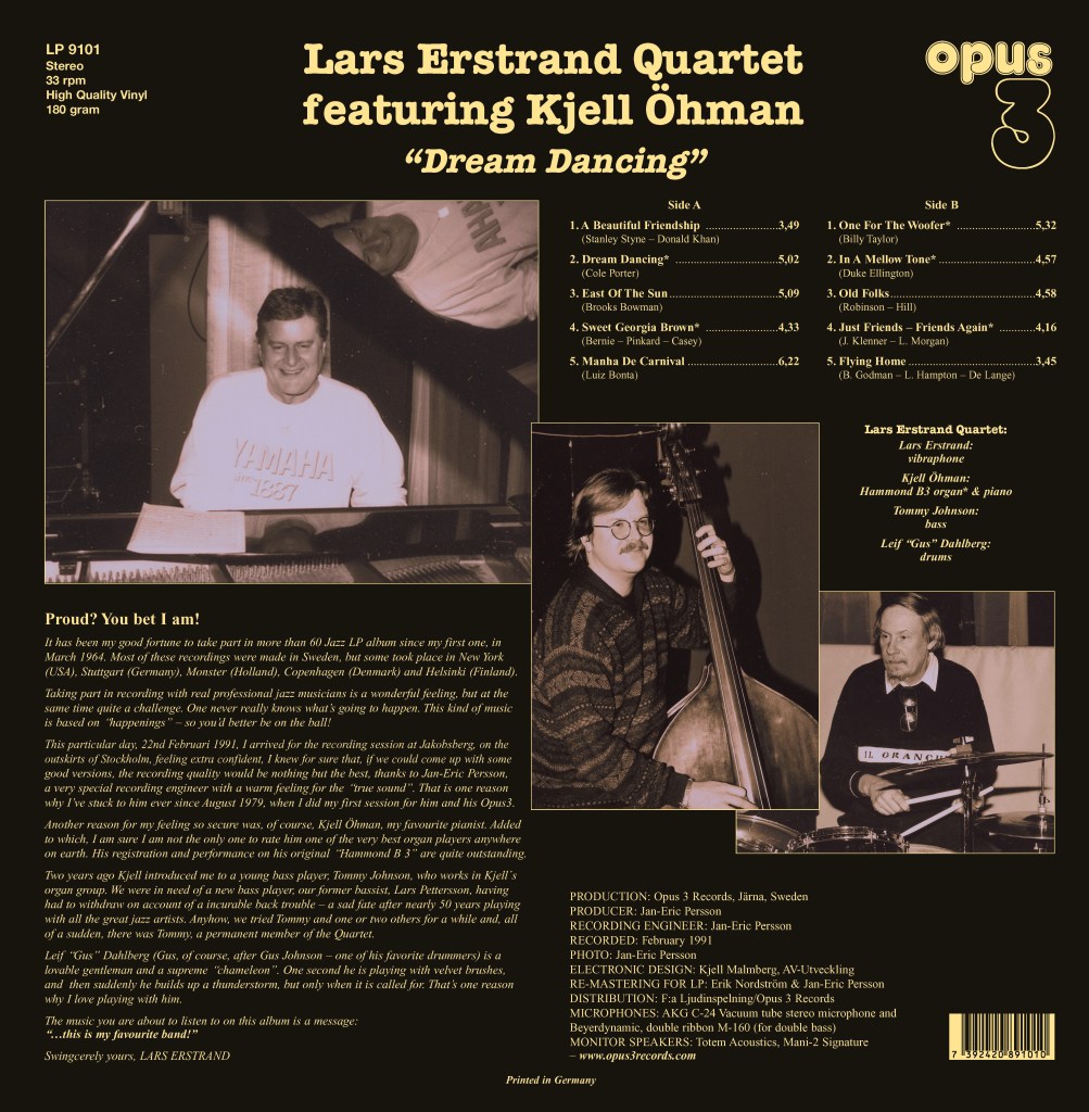 Efter den kritikerrosade remastringen av Kjell Öhmans album med Arne Domnerus på sax fick Jan-Eric blodad tand och började leta i arkivet med gamla inspelningar. Då hittade han Lars Erstrands album, Dream Dancing från 1991. En härligt svängigt skön jazzplatta. Det bästa av allt är att Kjell Öhman finns med i hans band. Hans sätt att spela på sin B3 Hammond fick B3-nördarna att vakna till liv i hela världen när den skivan släpptes. Här kommer två korta utdrag ur en amerikansk och en tysk recension.